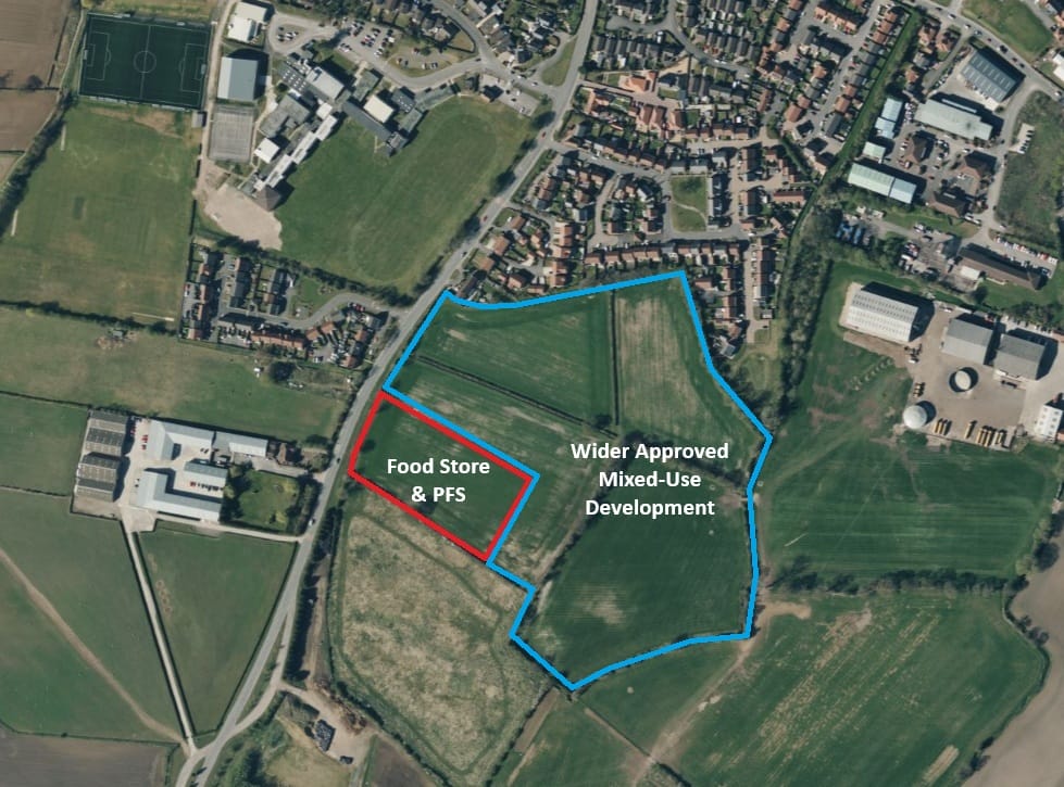 The proposed food store and petrol filling station represents the first phase of development. A separate reserved matters application will be submitted in 2026 for the proposed housing, care home and medical facilities.